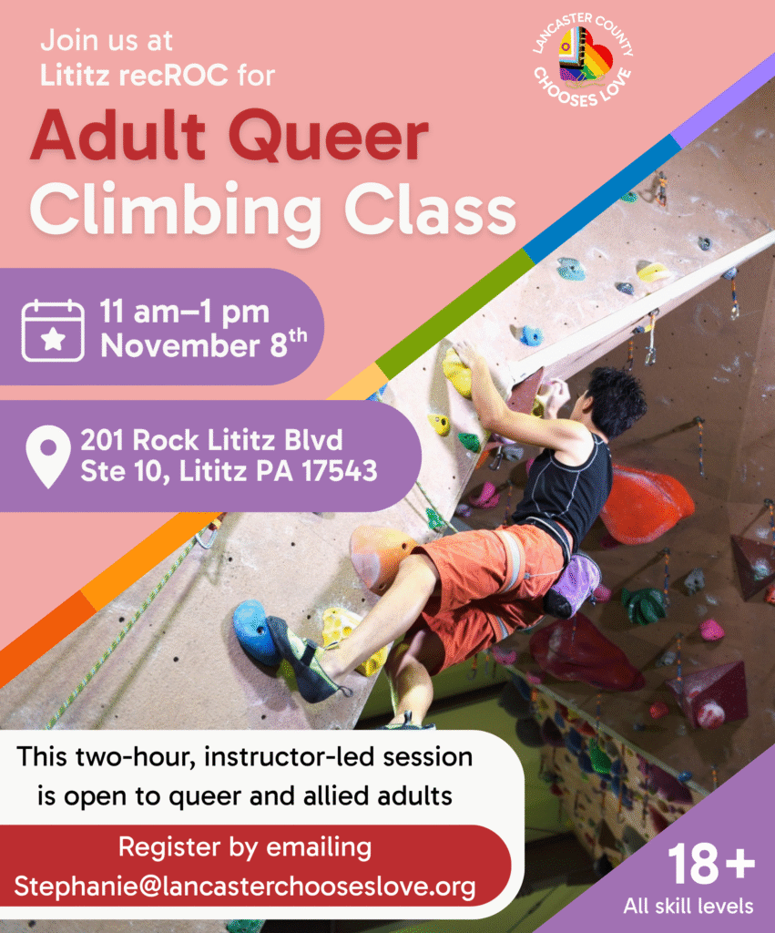 Join Lancaster County Chooses Love for a fun and supportive climbing session designed for queer and allied adults (ages 18+). This two-hour, instructor-led event welcomes all experience levels, from first-time climbers to those who’ve been scaling walls for years.