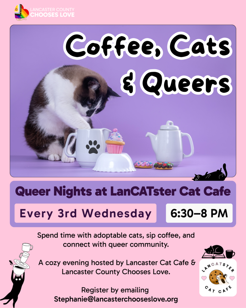 Coffee, Cats, & Queers is a recurring Lancaster County Chooses Love community night held at Latcatster Cat Café on the 3rd Wednesday of each month, beginning in January 2026, from 6:30–8:00 PM.