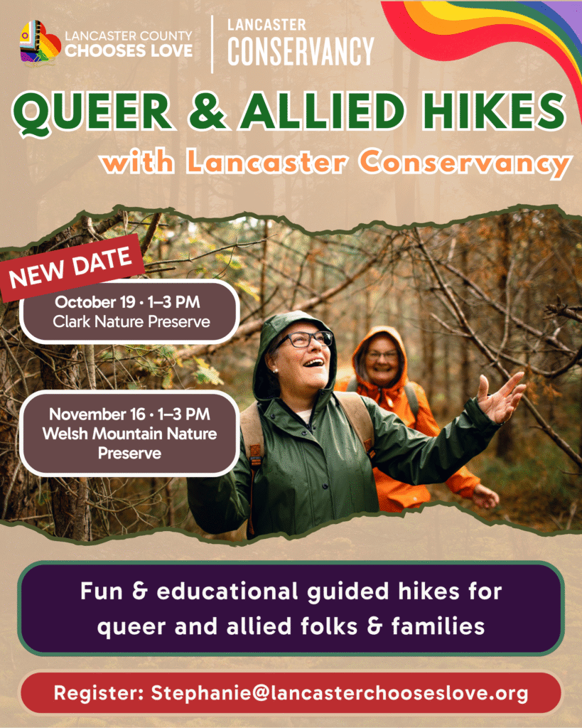Step into nature with us this fall! Lancaster County Chooses Love and Lancaster Conservancy are teaming up for two guided hikes designed for queer and allied folks and families. These hikes will be both fun and educational, offering a welcoming space to connect with community while exploring our local preserves.
