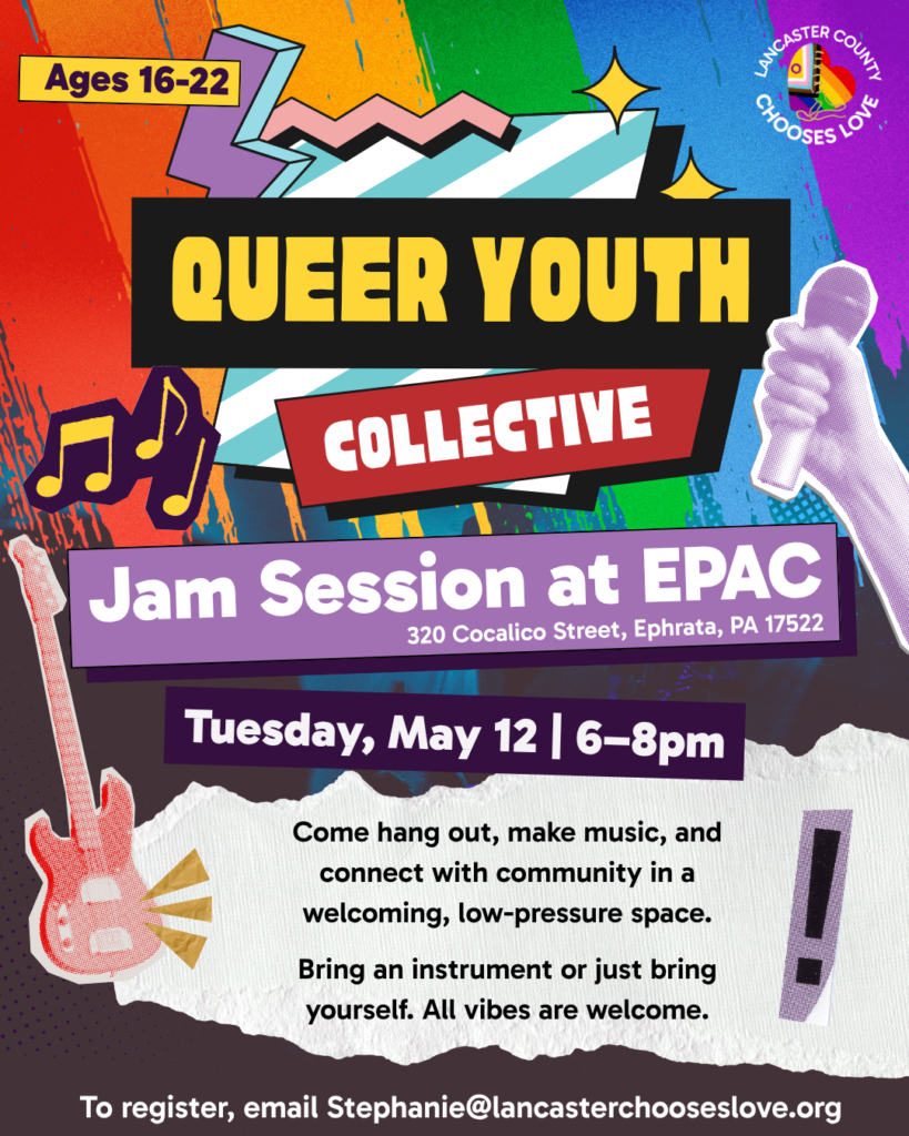 Queer and allied youth ages 16–22 are invited to join us for a relaxed and welcoming jam session at the EPAC rehearsal space.