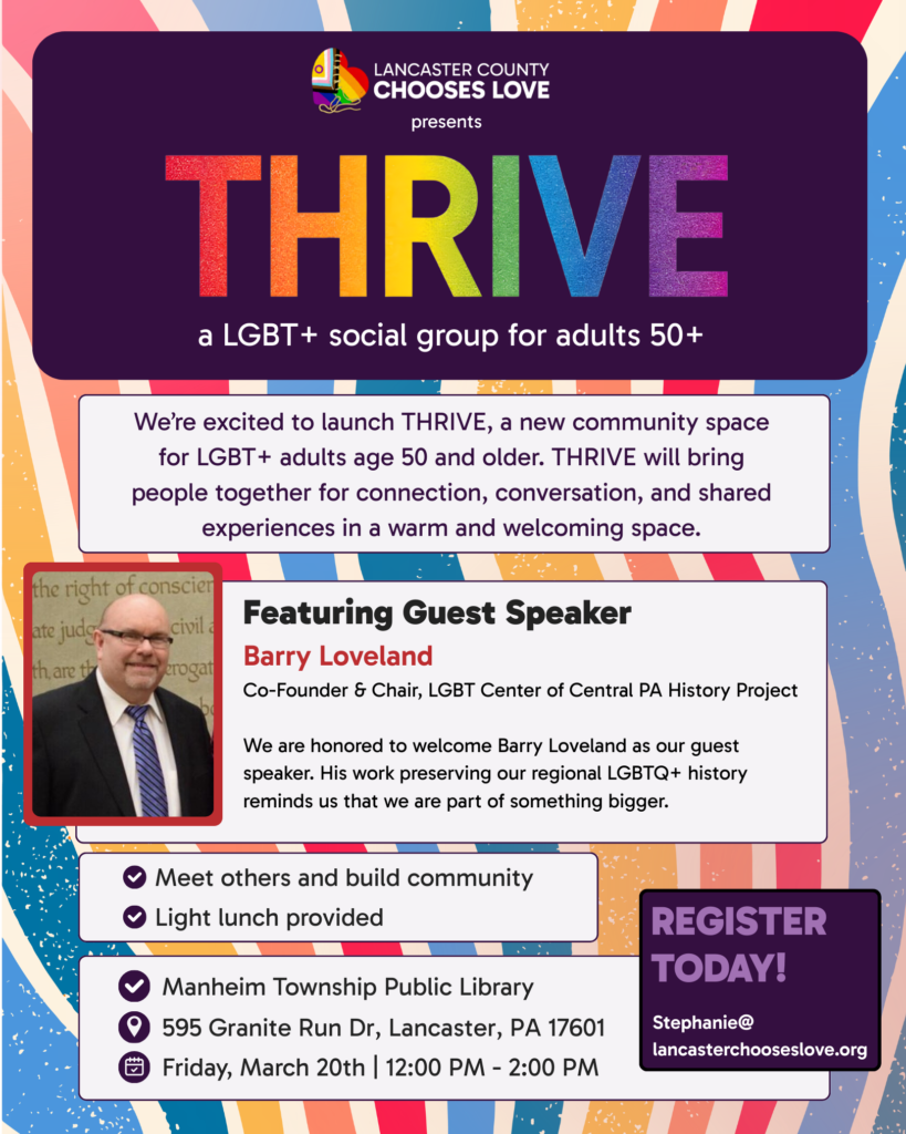 At our March gathering, we are honored to welcome guest speaker Barry Loveland, Co-Founder and Chair of the LGBT Center of Central PA History Project. Barry has been an out gay activist since 1977 and has dedicated his work to preserving and sharing the stories of LGBTQ+ communities across Central Pennsylvania. His insights remind us that our local history matters and that our stories deserve to be remembered.