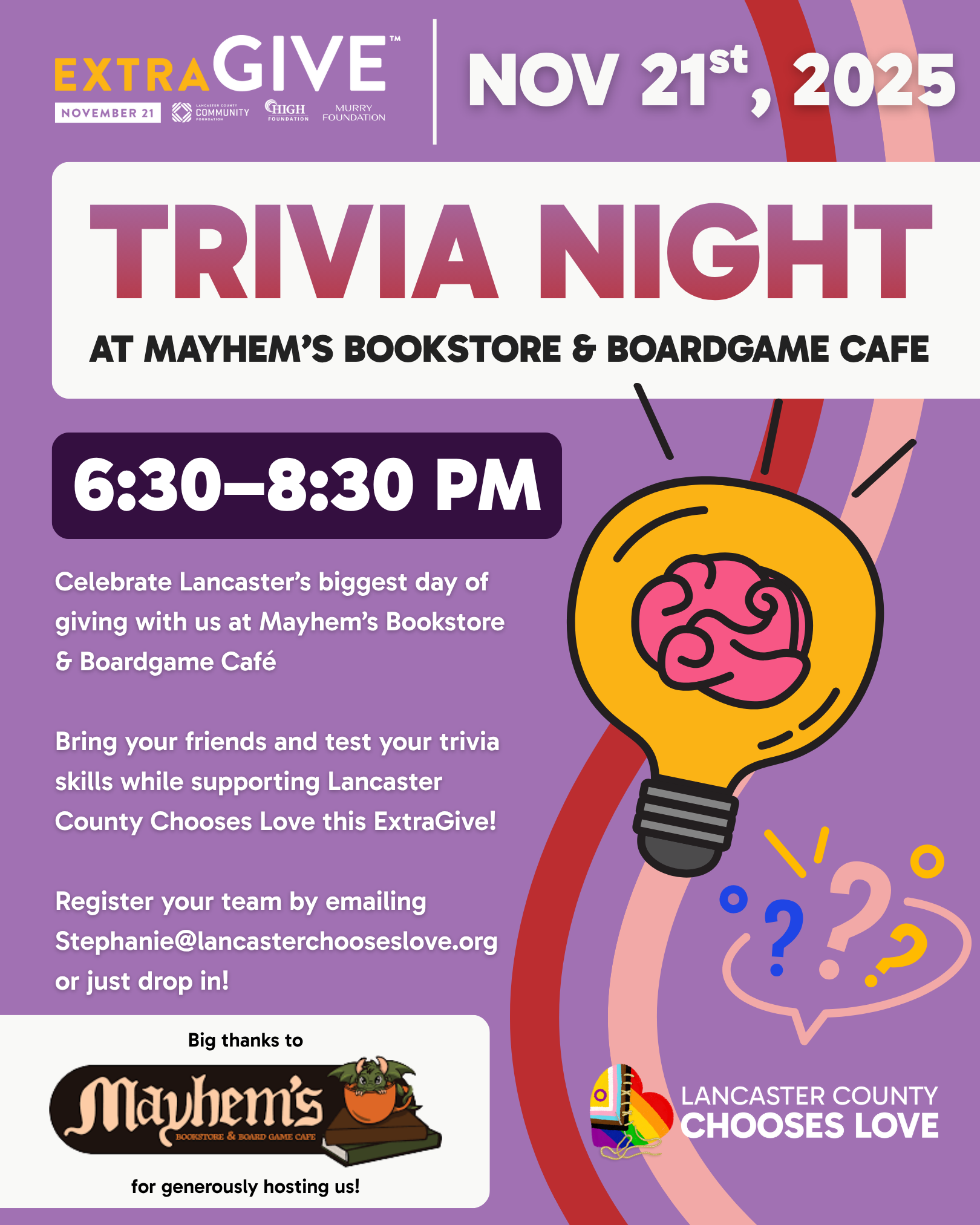 ExtraGive Trivia Night🗓 Friday, November 21 | 6:30–8:30 PM📍 Mayhem’s Bookstore & Boardgame Café Celebrate Lancaster’s biggest day of giving with a fun night of trivia! Whether you’re a trivia master or just in it for the laughs, this event is a great way to connect with community and support Lancaster County Chooses Love during ... Read more