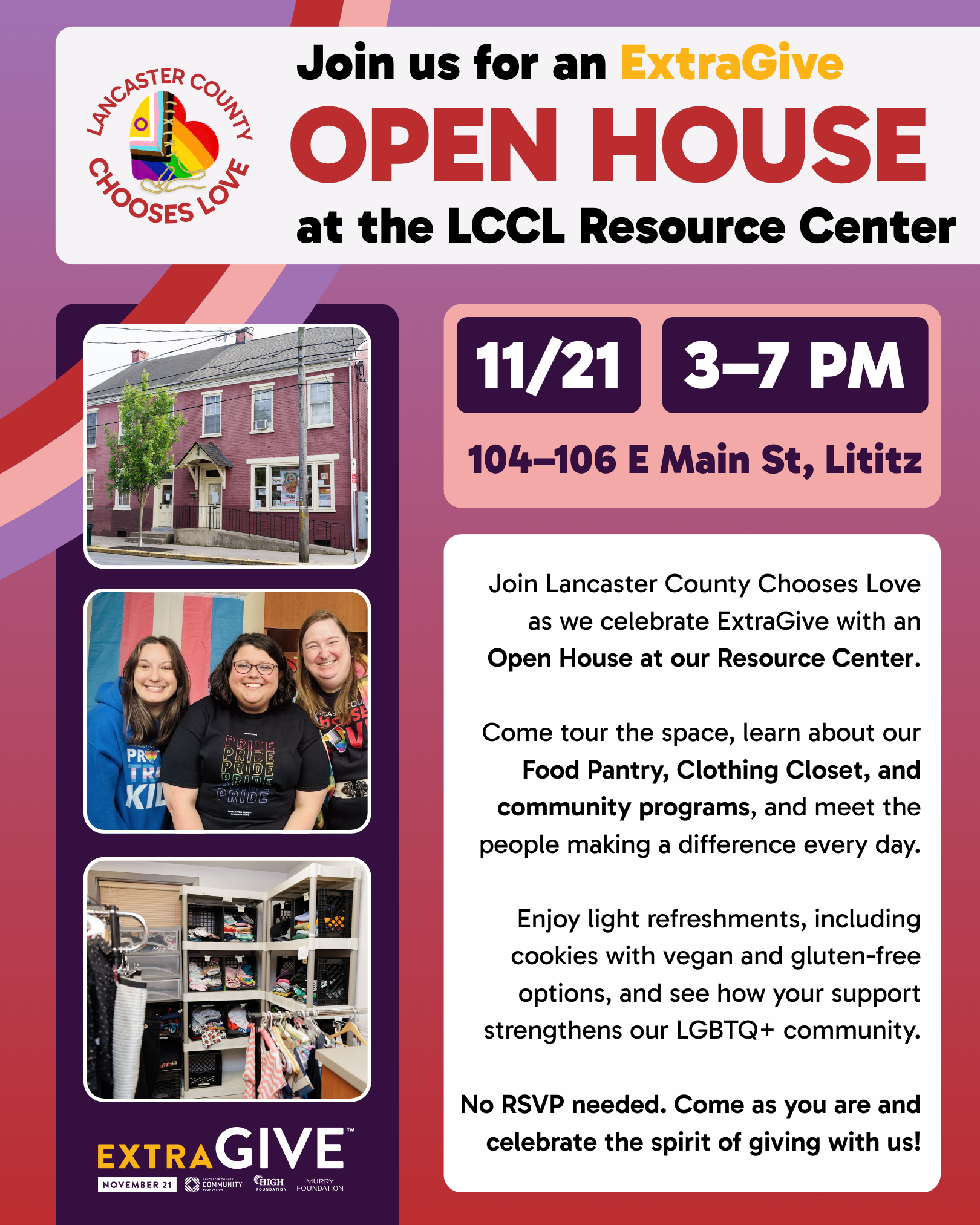 Extra Give Open House🗓 Friday, November 21 | 3–7 PM📍 Lancaster County Chooses Love Center Celebrate the Extraordinary Give with Lancaster County Chooses Love!We’re opening our doors for a special Open House where you can see firsthand the programs your support makes possible — from our Food Pantry and Clothing Closet to our inclusive community ... Read more
