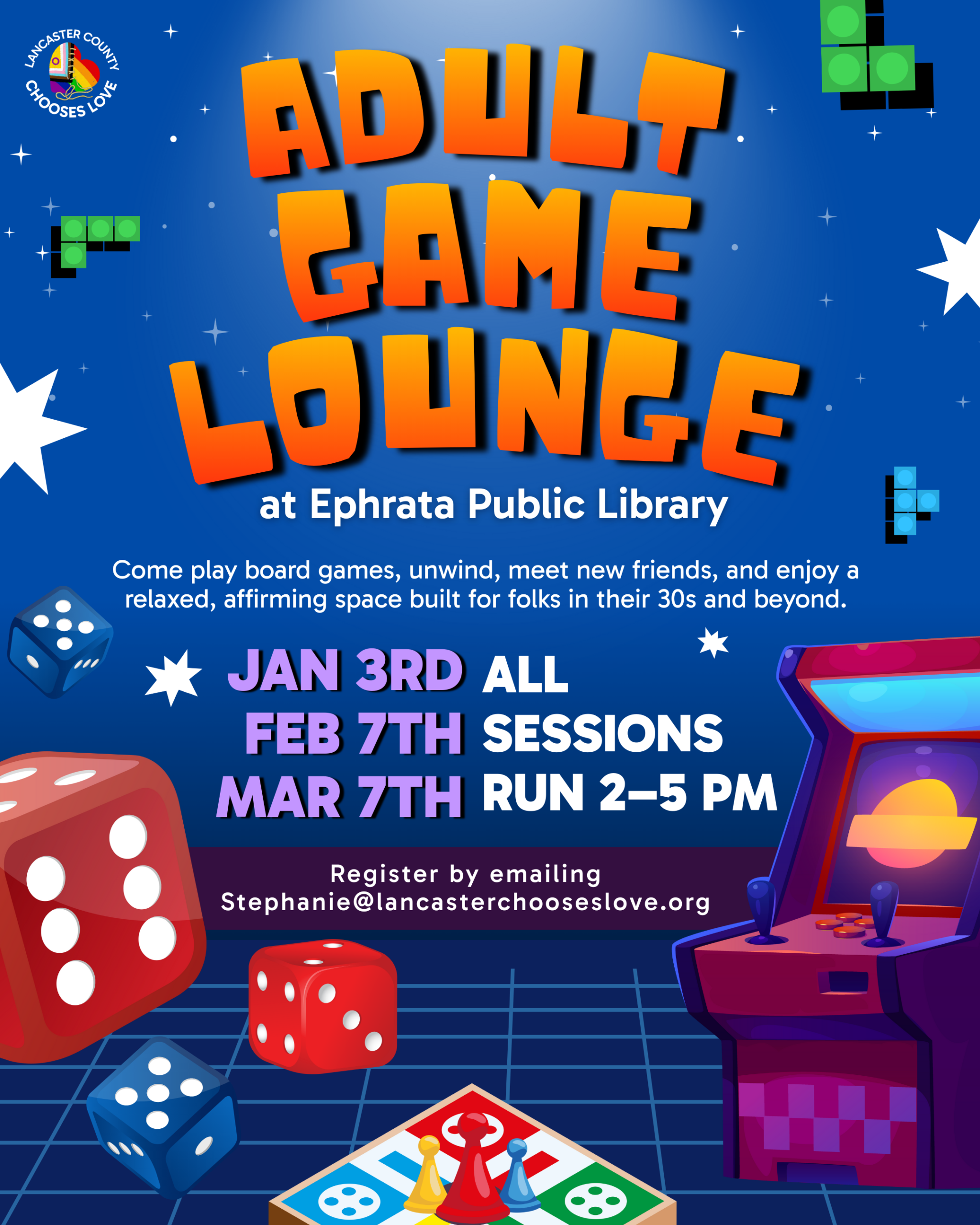 Our Adult Game Lounge returns with new dates for the new year! This ongoing program offers LGBTQ+ adults 30+ a welcoming place to gather, play board games, and build community in a low-pressure, fun environment. Upcoming Sessions:• Saturday, January 3 — 2–5 PM• Saturday, February 7 — 2–5 PM• Saturday, March 7 — 2–5 PM ... Read more
