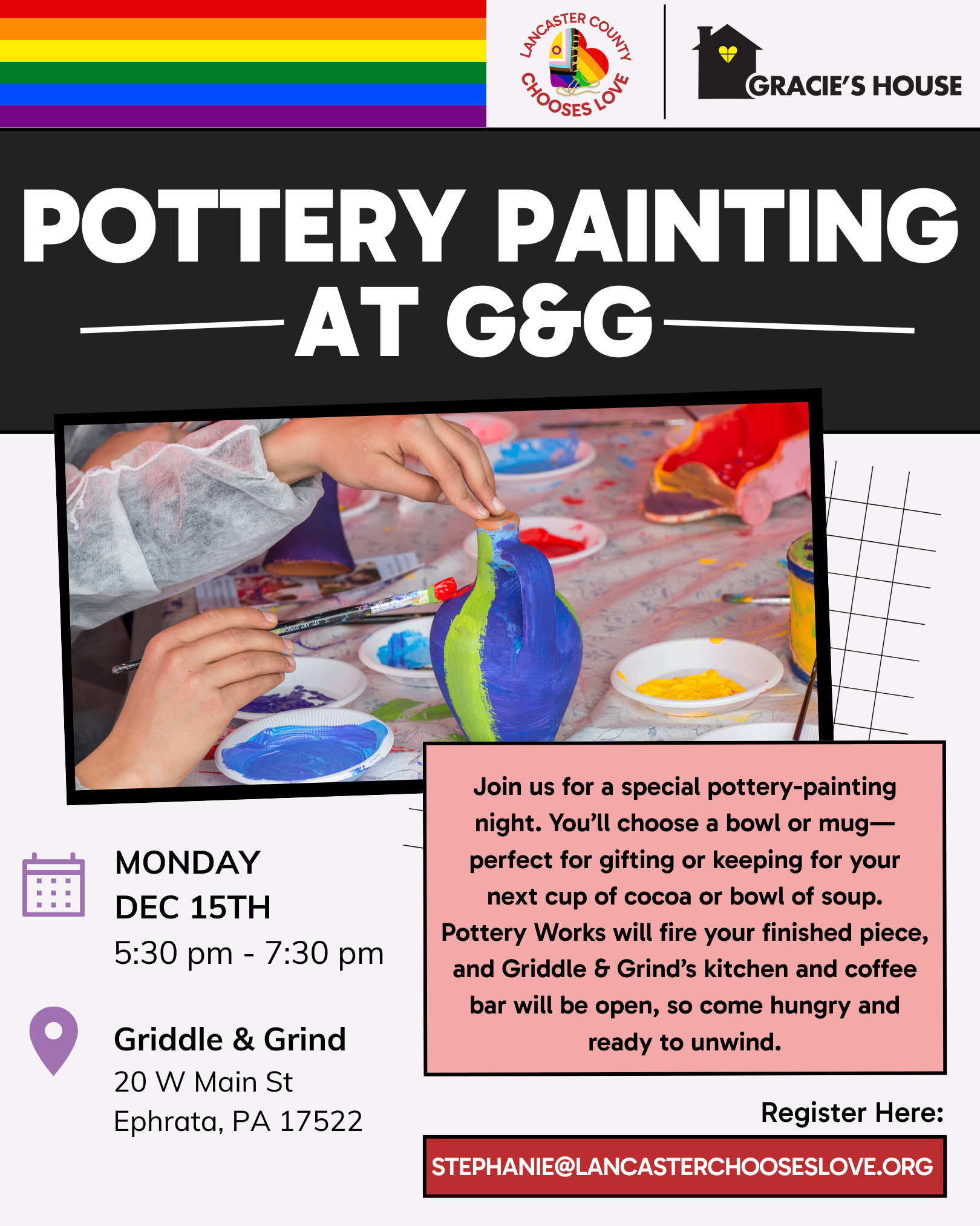 Griddle and Grind Cafe 20 W. Main Street, Ephrata, PA, United StatesJoin us for a relaxed, creative evening at Griddle & Grind as we paint pottery pieces with support from The Pottery Works. You’ll choose either a bowl or a mug—the perfect winter keepsake or handmade holiday gift. Griddle & Grind’s kitchen and coffee bar will be open throughout the event, so bring your appetite and ... Read more