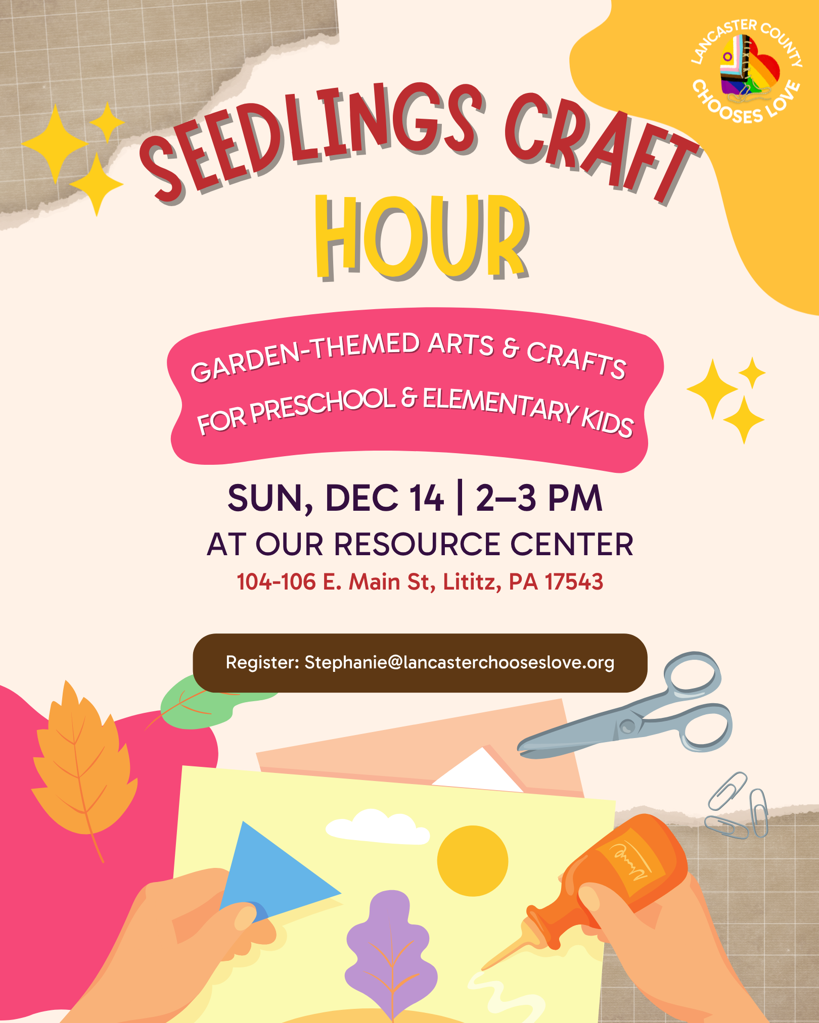 Lancaster County Chooses Love Building 104-106 E. Main St., Lititz, PA, United StatesThis month's event has been cancelled. Garden-themed arts and crafts. For preschool and elementary kids. Join us at the LCCL Resource Center for this month’s Seedlings Craft Hour! 📅 Sunday Decemeber 14 - Cancelled🕓 2:00 - 3:00 PM📍 LCCL Resource Center (104–106 E. Main St., Lititz) All supplies are provided, and everyone is welcome to ... Read more
